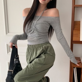밤나비 입술넥 이중 홀터 슬림 티셔츠