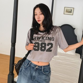 운아설 매쉬 레터링 프린팅 크롭 반팔 티셔츠