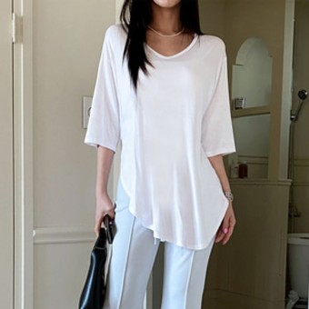 핑임팔 무지 브이넥 루즈핏 트임 반팔 티셔츠