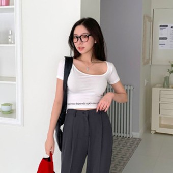 핼니스 레터링 크롭 반팔 언발넥 티셔츠