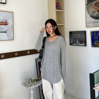 제이주 무지 라운드 U넥 긴팔 티셔츠